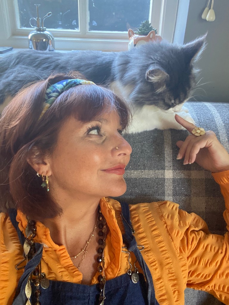 Wearing my favourite, oldest vintage dungarees today with my vintage orange shirt. It’s quite bright, but that’s the 70’s for you! And introducing one of my Maine coones, Sid. He’s like my doggy and follows me everywhere.